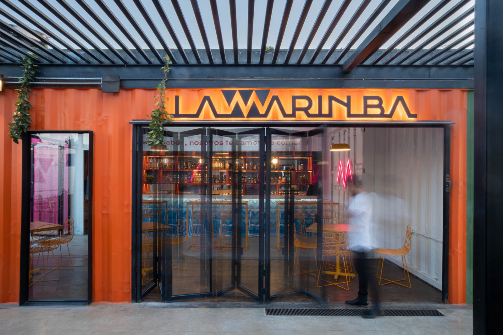 La casa mantiene un aspecto monocromático en tonalidades oscuras y neutras, permitiendo que los interiores resplandezcan con sus tonalidades cálidas.