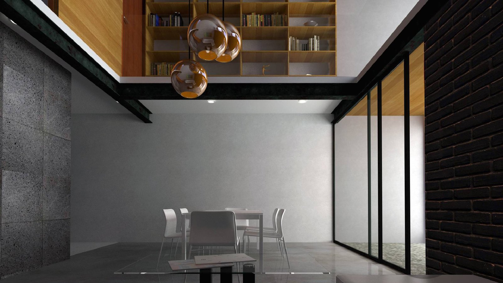 The home maintains a monochromatic appearance with dark and neutral tones, allowing the warm interiors to shine.