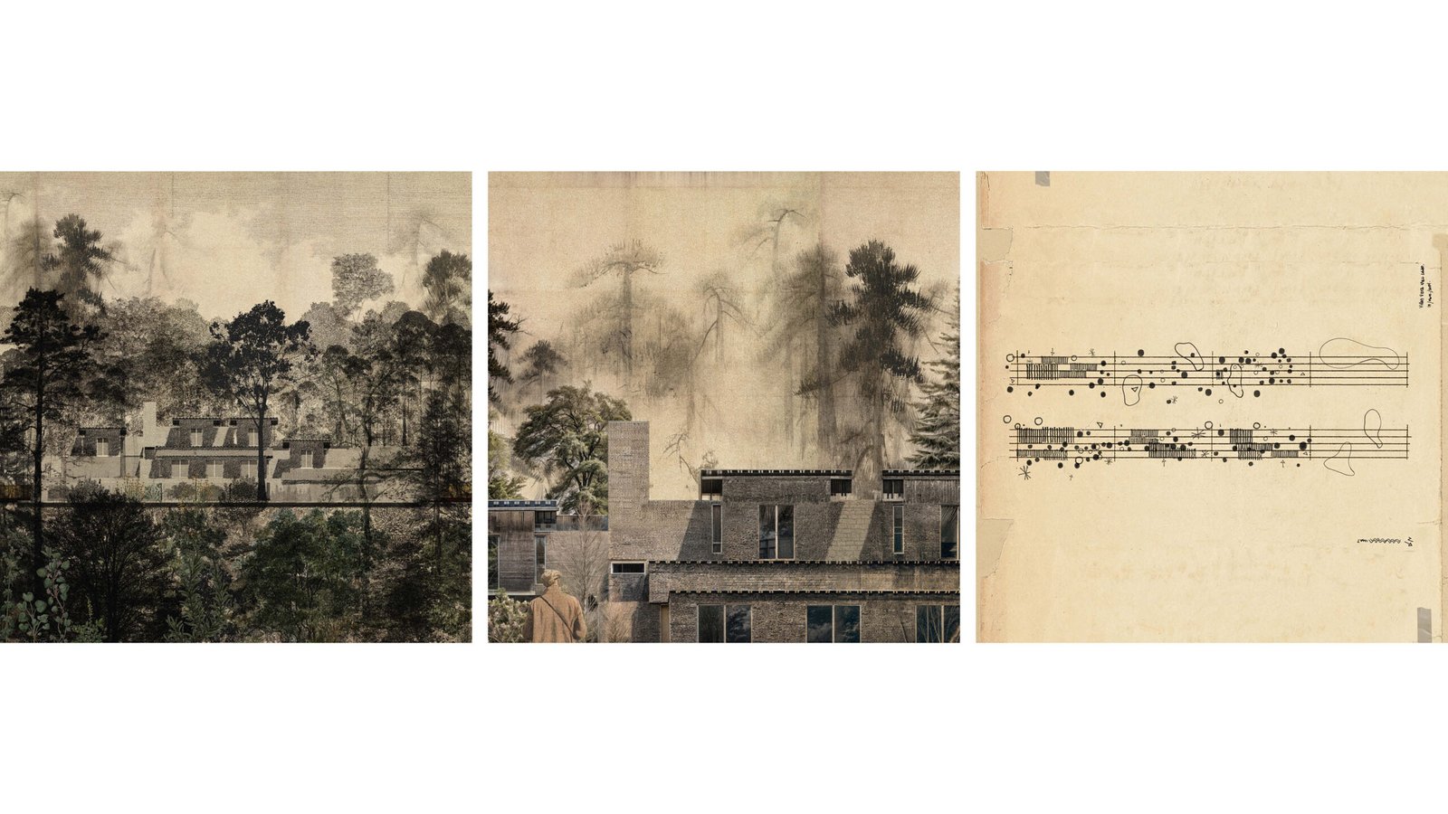 Las casas son fragmentos que se posicionan frágilmente a lo largo del terreno, manteniendo vistas hacia los grandes encinos y ailes. Su asentamiento se rige a través de ejes rectores delimitados como en un pentagrama musical.